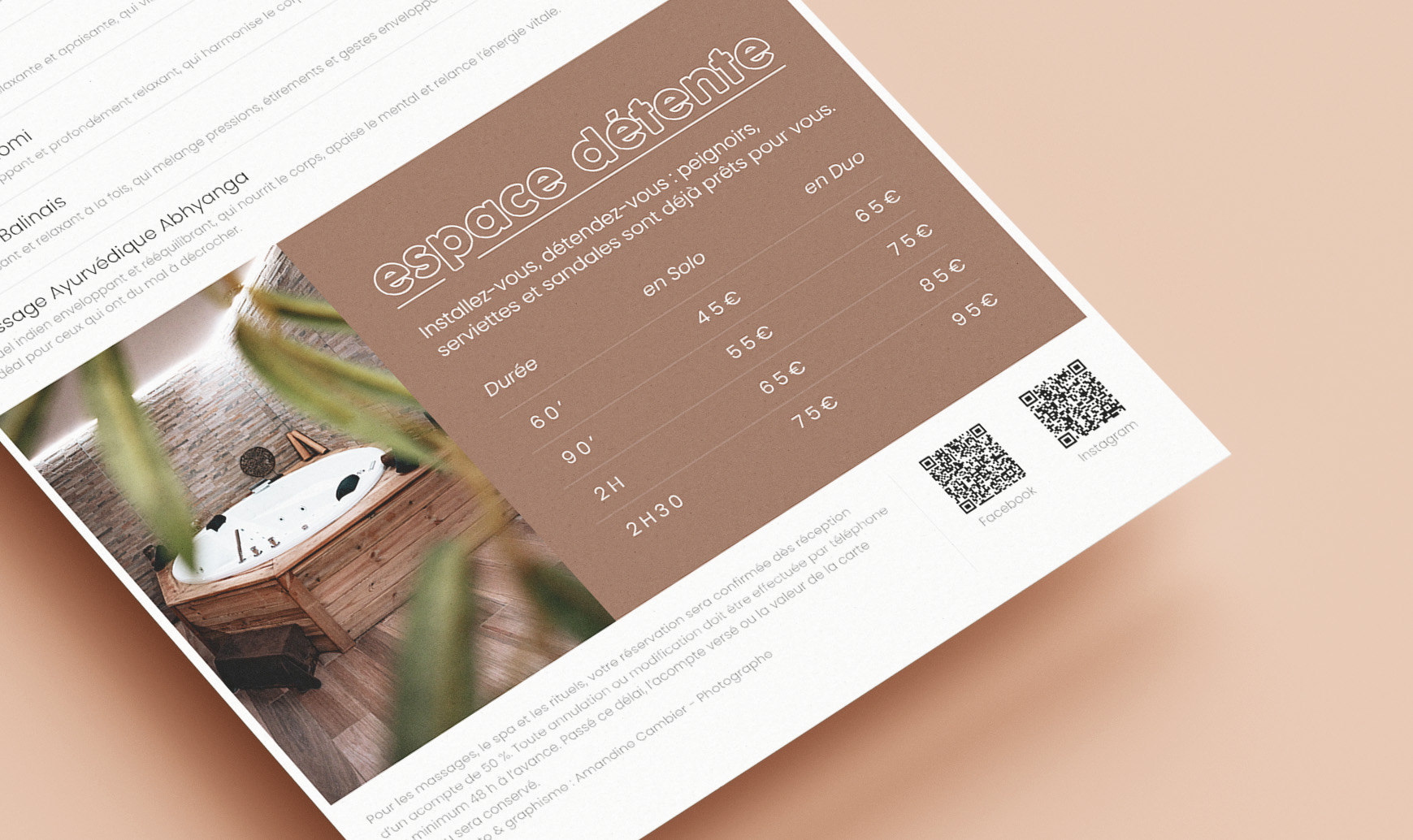 Ce support print a été pensé comme une invitation à découvrir l’intérieur du spa, à travers une direction artistique douce et immersive, associée à des photographies d’ambiance réalisées sur place. Les images permettent de projeter immédiatement le client dans l’univers du lieu, en mettant en valeur les espaces, la lumière et l’atmosphère propice à la détente.
